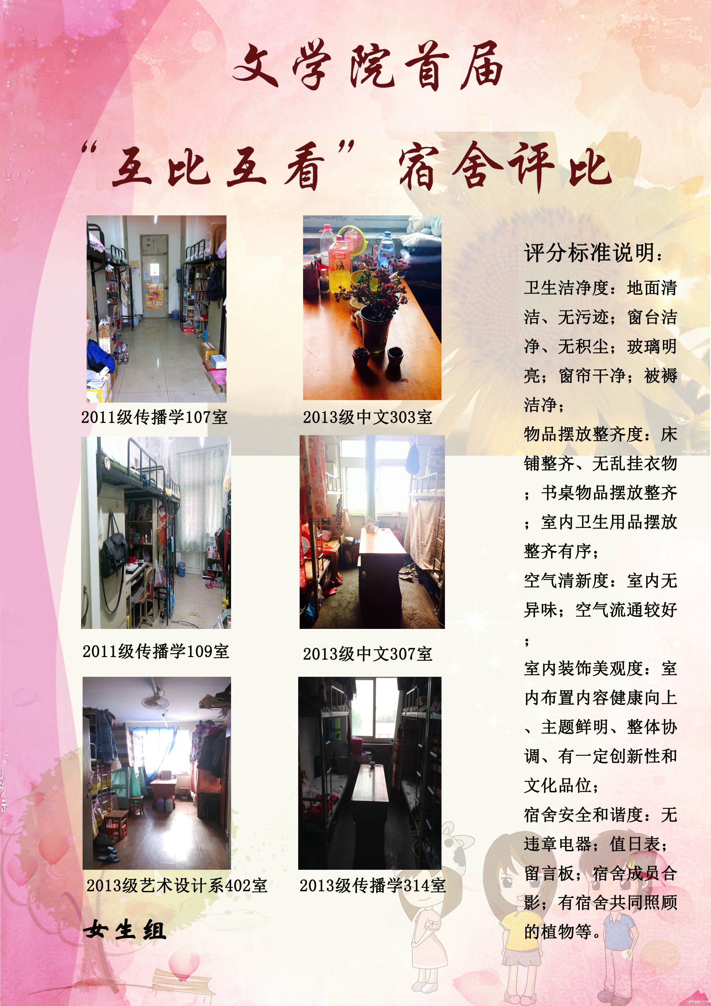 此次比赛面向2011级、2012级和2013级的全体本科生,共分为9个单位,进行跨年级、跨专业宿舍互比互看。每个单位评出一个优秀宿舍,学院予以表彰和奖励。评委由年级辅导员、专业班班长、生活委员、宿舍代表构成。评比内容集中于卫生洁净度、物品摆放整齐度、空气清新度、室内装饰美观度、宿舍安全及和谐度等五个方面。