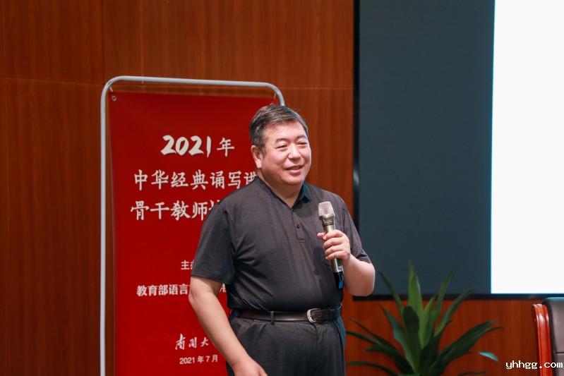 杨继荣代表天津市语委、市委教育工委、市教委协作支援与语言文字处向培训班的顺利举办表示热烈的祝贺。他提出,“中华经典诵写讲骨干教师培训”就是要让中小学教师能够对中华文化经典进行诗文讲解、诗文诵读和规范书写,进一步提升教师中华经典诵读、书写、讲解的专业素养和教学水平,自觉地将传统文化的精髓贯穿到日常课堂教学中,从而更好地传承弘扬中华优秀语言文化。