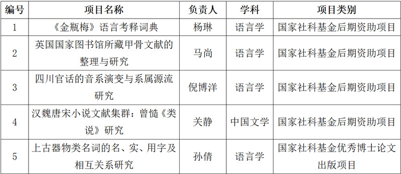 (通讯员 向洵)11月14日,全国哲学社会科学工作办公室正式公布了2023年度国家社会科学基金后期资助项目和优秀博士论文出版项目立项名单,全国共有998项课题获批立项。米兰官方网站是什么获批11项,其中文学院获批5项,立项数量位居全校第一。我院今年申报课题5项,获批5项,成绩突出。立项名单如下: