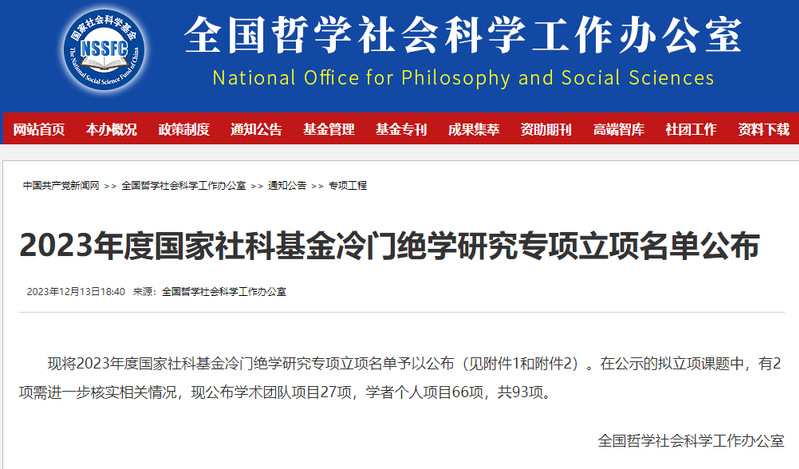 近日,全国哲学社会科学工作办公室公布了2023年度国家社科基金冷门绝学研究专项立项名单,有27个学术团队项目、66个学者个人项目获批立项。我院中文系赵建成副教授申报的课题获研究专项学者个人项目。该项目参照国家社科基金重点项目标准资助,一般每项资助35万元。这是我院获得的首个冷门绝学研究专项项目。