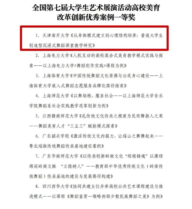 近日,据教育部发布的全国第七届大学生艺术展演活动各项目评选结果的公示,我院文化素质教学部青年教师马春靓在高校美育改革创新优秀案例评选中荣获一等奖,获奖论文为《从身体模式建立到心理结构培养:普通大学生创造型沉浸式舞蹈课堂教学研究》。